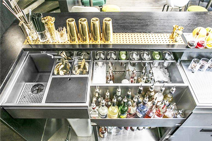quay-bar-pha-che-tra-sua - Phía trên phần quầy bar thường sẽ không bỏ khung, vì để đáp ứng nhu cầu ngồi thưởng thức đồ uống và các thao tác chuyên nghiệp của các Bartender. Nên phần trên sẽ được thiết kế thành 1 bàn dài.
