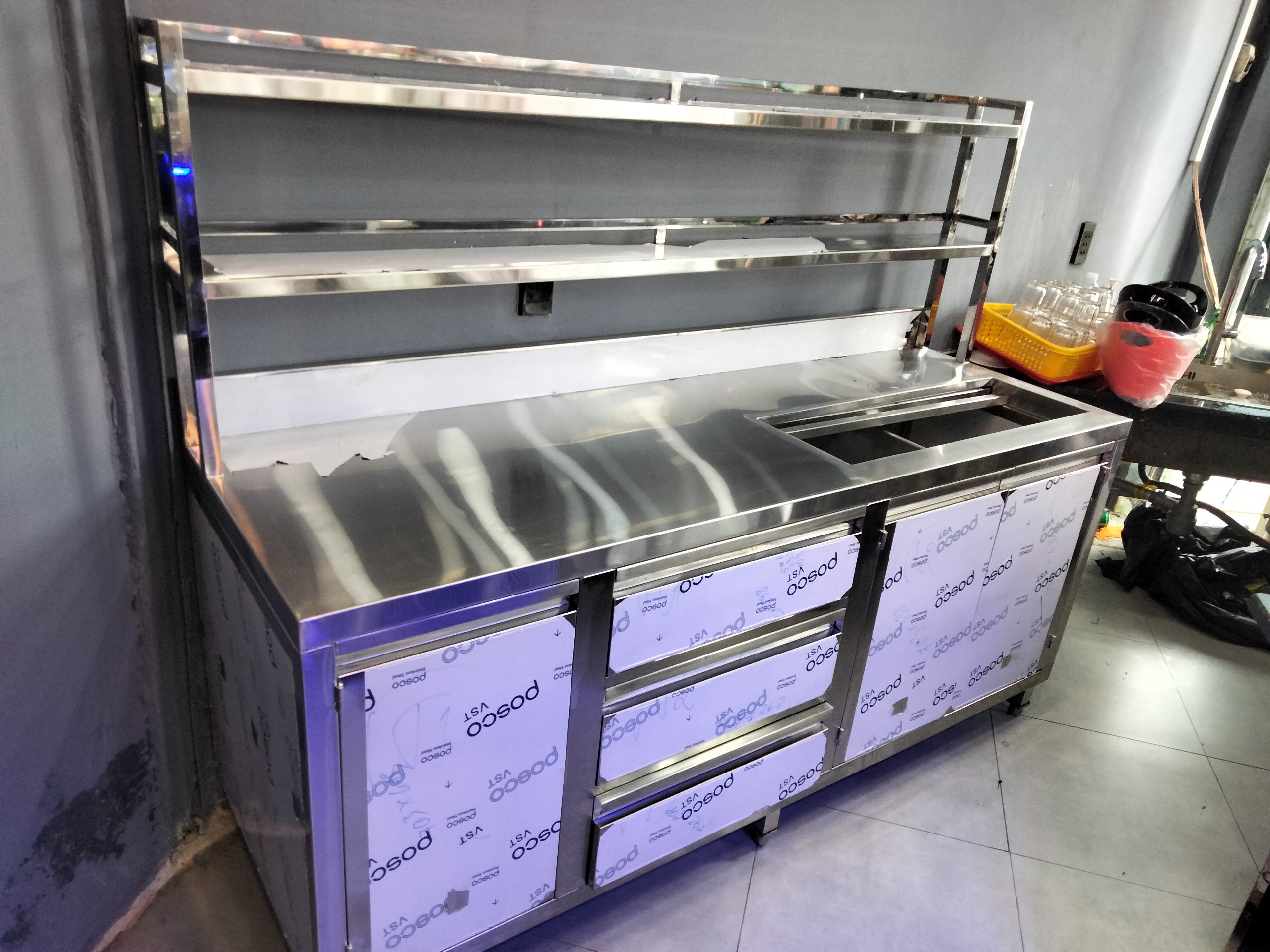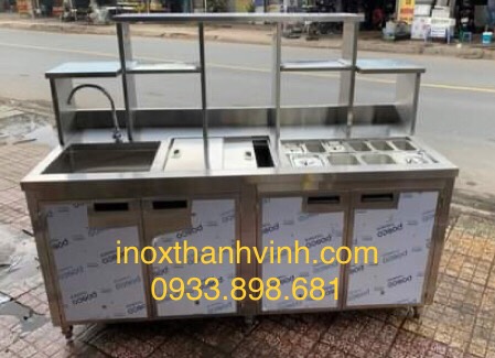 Mặt quầy pha chế: mặt quầy để được nhiều đồ dùng, thiết bị. Inox 304 dày dặn cứng cáp gia tăng tuổi thọ cho sản phẩm và dễ dàng cho quá trình vệ sinh.