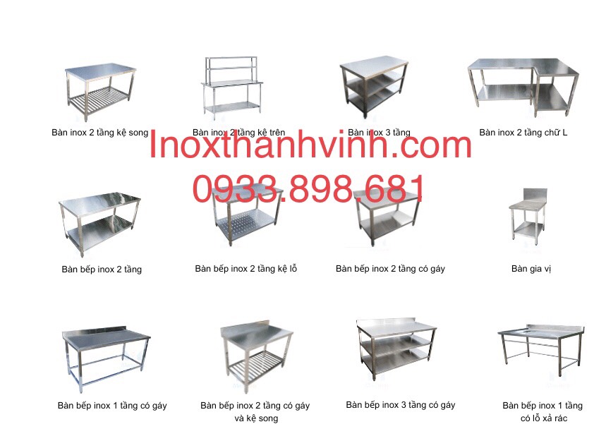 Bàn inox 1 tầng, 2 tầng, 3 tầng : Tùy theo không gian và nhu cầu sử dụng, bạn có thể chọn bàn có một, hai hoặc ba tầng để tăng diện tích làm việc và cất giữ đồ.