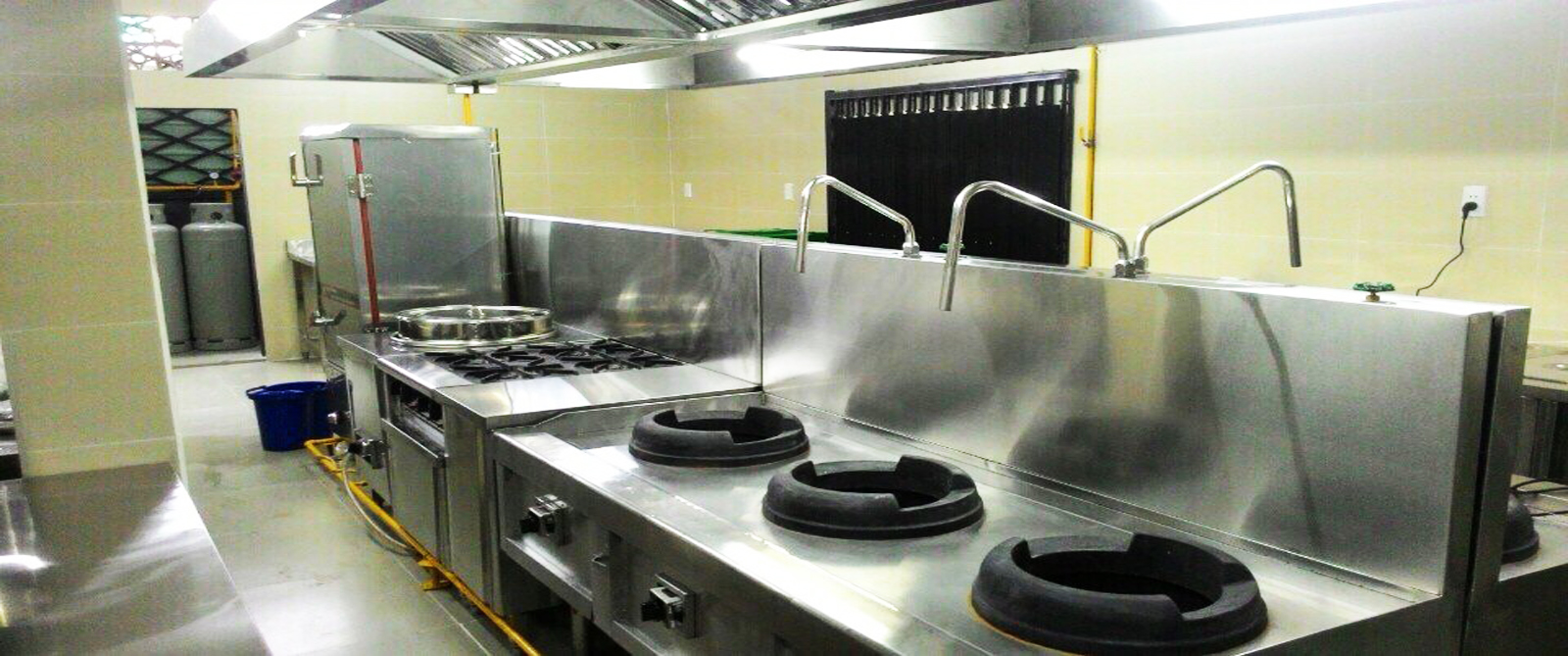 Các thiết bị trong hệ thống bếp công nghiệp được thiết kế với công suất lớn: Bếp công nghiệp, chậu rửa inox công nghiệp, Kệ inox công nghiệp, các loại tủ có công suất lớn, tủ cơm, bàn inox công nghiệp…